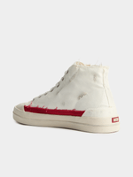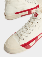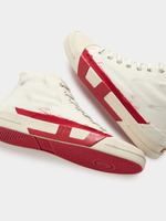 A high-top style, these men's canvas sneakers feature a bold take on Diesel's iconic red D logo. The originally tiny emblem is rendered in a dual fabric and rubber design that's split between the upper and sole in blown-up proportions. The shoes are frayed and distressed with dirty-effect smudging, lending them a worn, beaten-up feel.