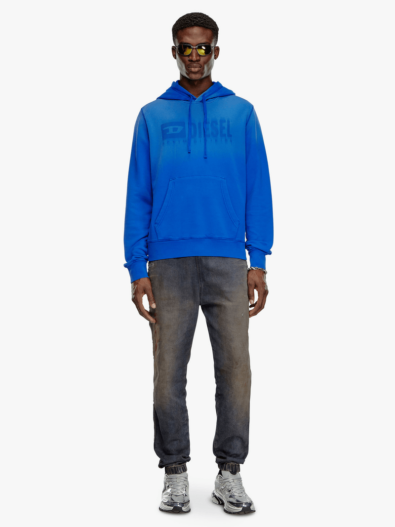 Men's hooded sweatshirt made from organic cotton. Designed for a regular fit, this style has been treated to create a lived-in fade, as if it has been exposed to sunlight. The faint and smudged logo only furthers its worn-in appeal.
