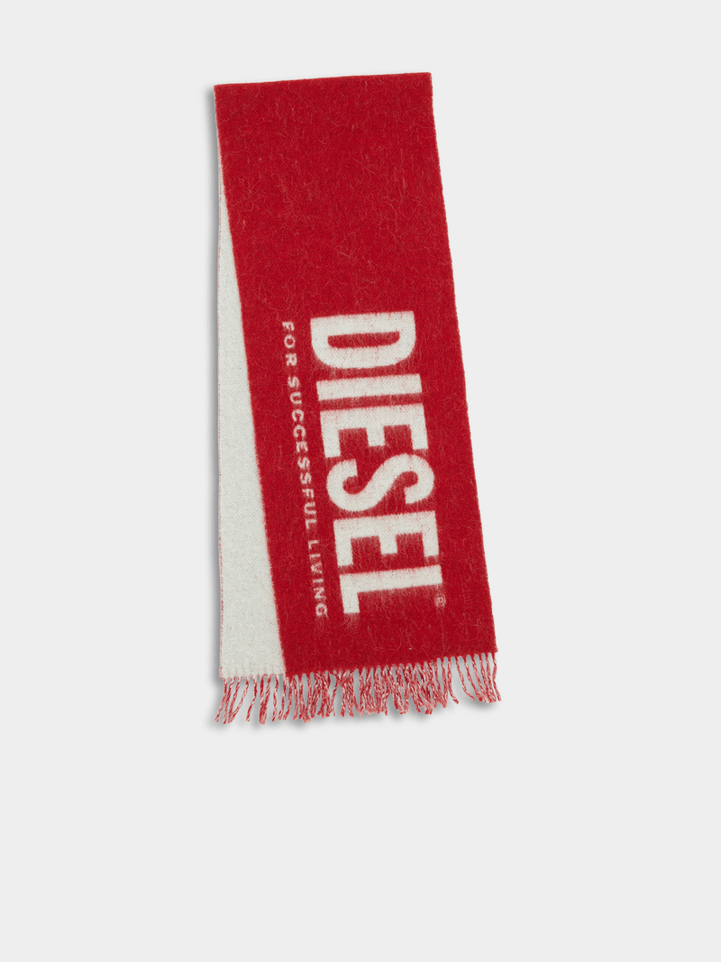 Men's two-tone jacquard scarf knitted from a soft wool and alpaca blend. Constructed with contrasting block red and white colourways on each side, it's embellished with tassel trims and a maxi Diesel For Successful Living logo on one end.