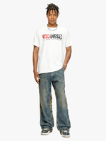This men's tee is made from organic cotton jersey. Cut in a regular fit, it features a glitchy, layered take on the classic Diesel Denim Division logo, cracked and flocked for a worn-away look and a textured feel.