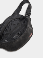 A utilitarian staple in denim, this men’s bum bag has a lived-in black hue and a metal logo plaque punctuating the front. It fastens with a two-way zip and has a comfortable mesh back fitted with a secure pocket.
