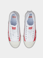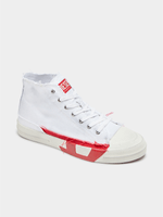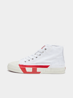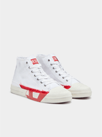 A high-top style, these men's canvas sneakers feature a bold take on Diesel's iconic red D logo. The originally tiny emblem is rendered in a dual fabric and rubber design that's split between the upper and sole in blown-up proportions. The shoes are frayed and hand-distressed with dirty-effect smudging, lending them a worn, beaten-up feel.