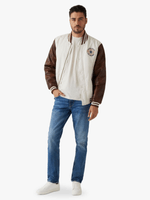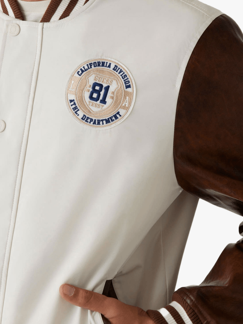 Elevate your style with the Guess Sand Varsity Bomber Jacket. Made of 100% polyester, this jacket features a classic bomber style with long sleeves and a regular fit. Easy to care for with cool wash instructions. Made for those who appreciate quality and comfort. Add this versatile piece to your wardrobe today!