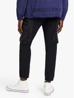 These MKM Utility Pants serve comfort and style with their jogger-like fit, mix of fabrics, and tapered leg. They have an elasticated waistband with an adjustable drawstring, cargo-style flap and zipped pockets on the sides and fabric panels at the knees.