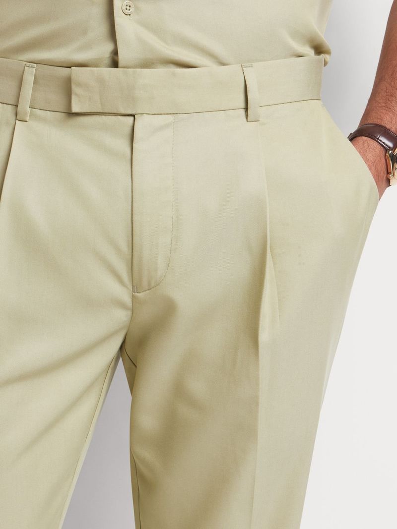 The Markham Pleated Tapered Tencel Trousers are a stylish and versatile addition to any wardrobe. Made from a luxurious Tencel blend, these pants feature a modern tapered fit, crisp pleats, and a rich green hue. The fabric is soft and breathable, making them perfect for all-day wear. With a blend of tencel and polyester, these pants are durable and eco-friendly. Ideal for both casual and formal occasions, these pants are a must-have for the fashion-conscious man.
