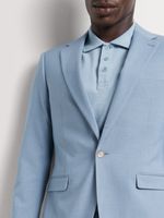 Elevate your style with our Markham linen suit jacket in light blue. Crafted from a PV stretch fabric, this skinny-fit jacket is designed for a sleek and modern look. It features cool iron and dry clean only care instructions. Perfect for any occasion, this jacket is a must-have for your wardrobe.