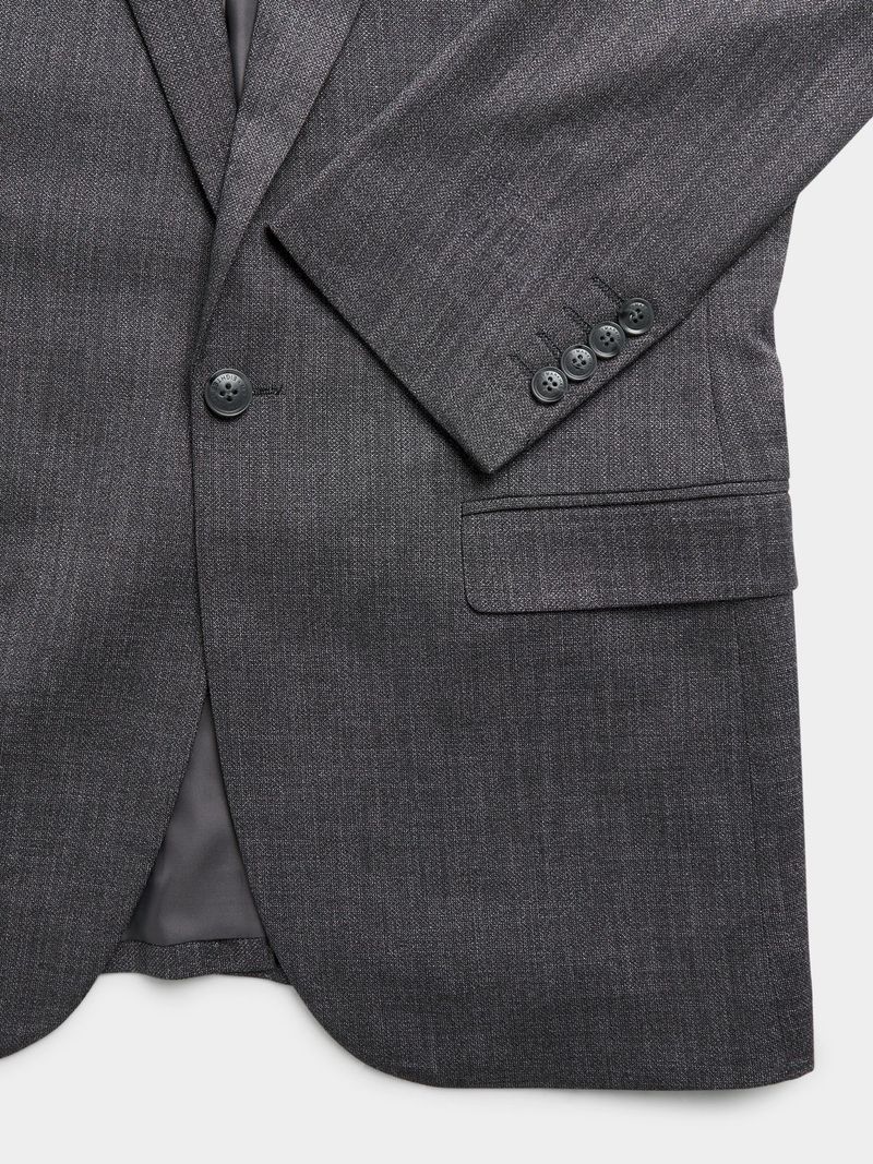 Elevate your style with the Markham suit jacket. This charcoal grey piece features a sleek skinny fit and textured fabric for a modern twist. Made with PV stretch material for comfort and easy movement. Perfect for any occasion. Cool iron and dry clean for long-lasting wear.
