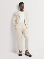 Elevate your style with our Markham linen utility trousers in stone. Designed for comfort with a slim fit, these trousers feature a PV stretch fabric for flexibility. Care instructions include cool ironing and dry cleaning only. Perfect for any casual or formal occasion.