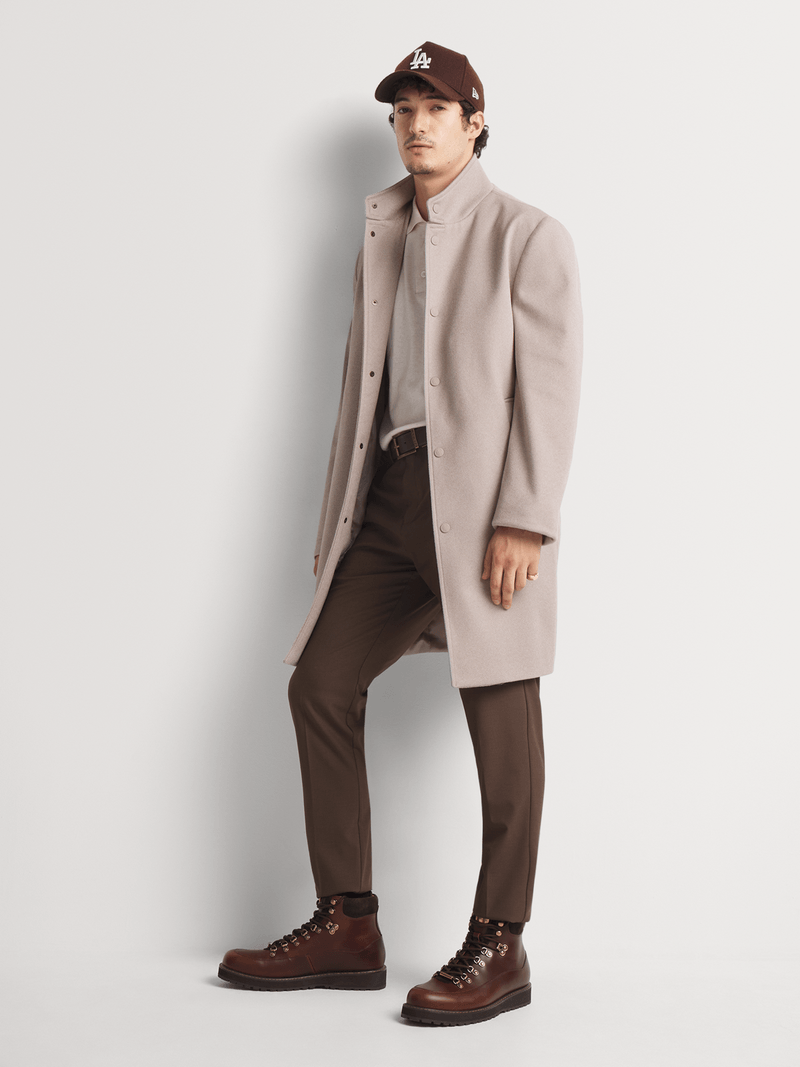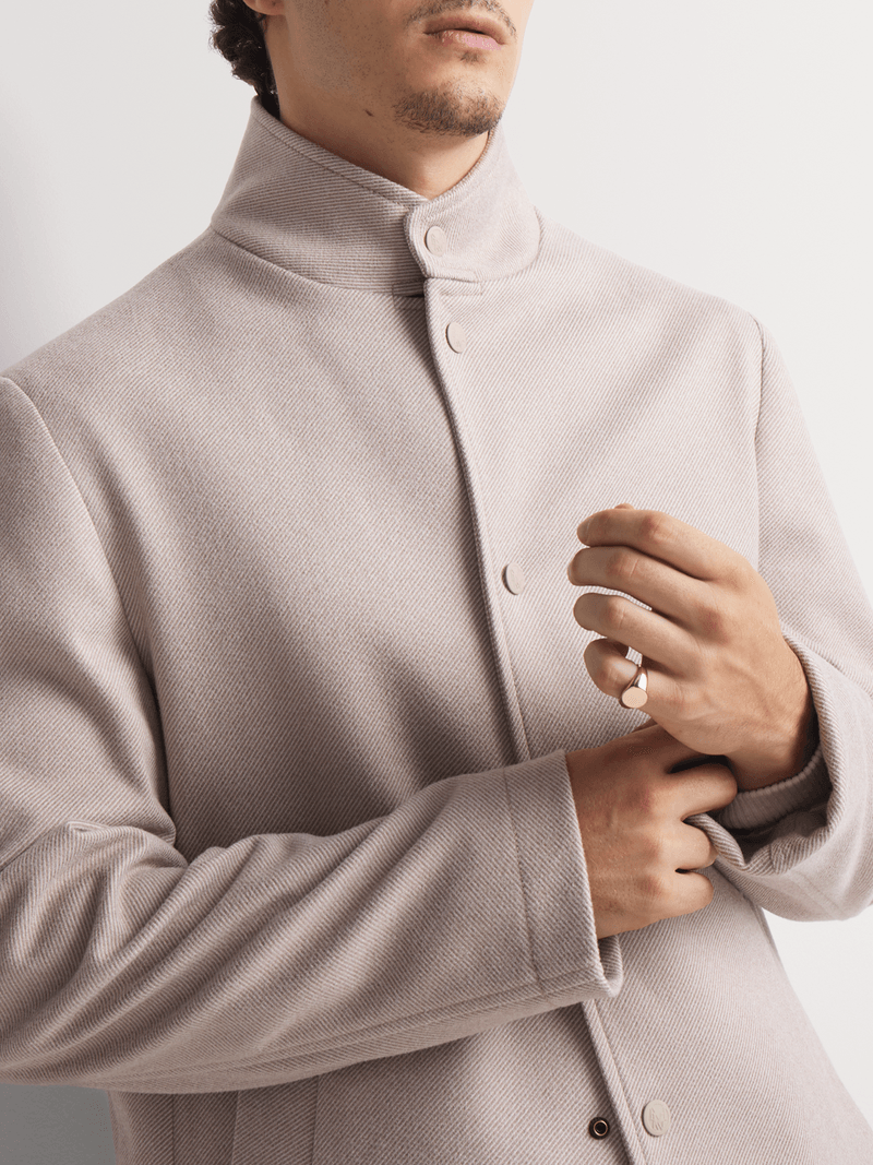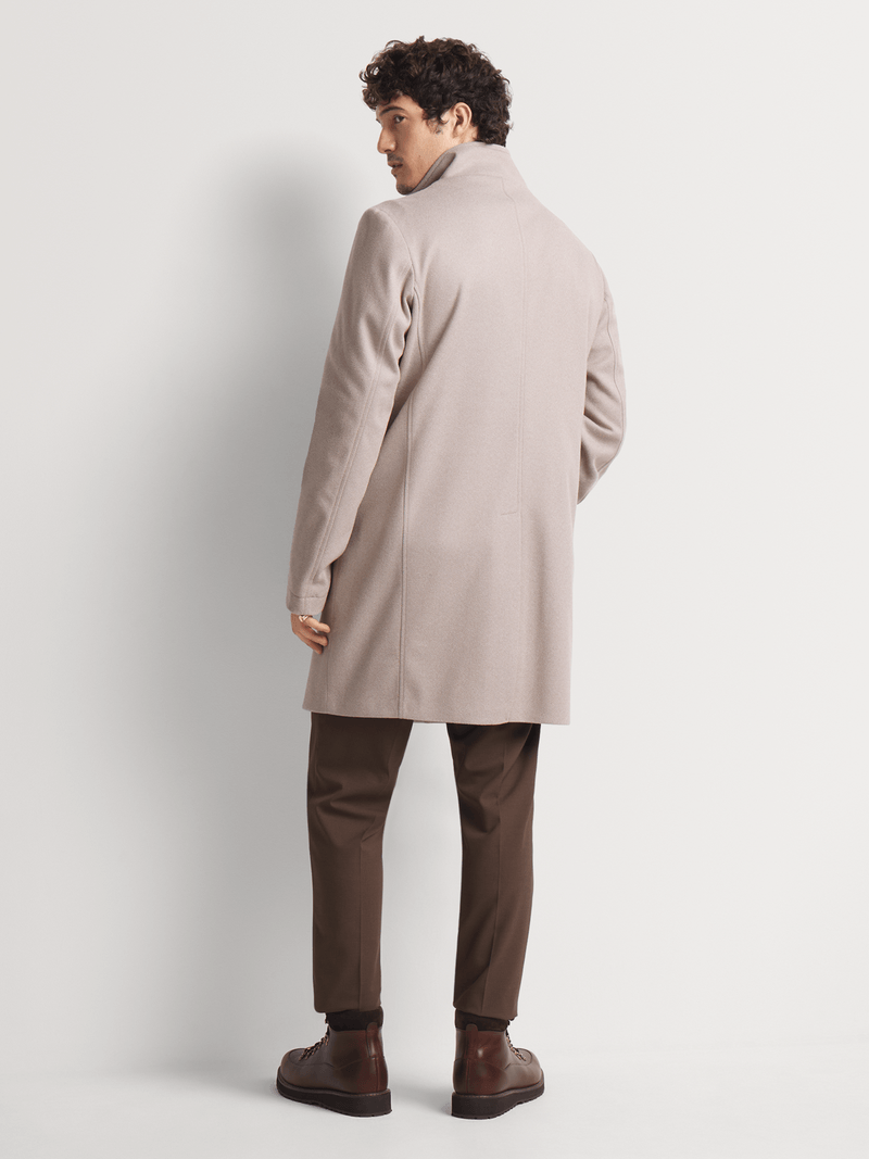 Stay sharp and stylish with the Markham Smart Funnel Neck Coat in Stone. This slimfit polyester coat is perfect for cool washes and is easy to care for. Made in South Africa, this coat is a must-have for any wardrobe. Stay on trend with this versatile piece.