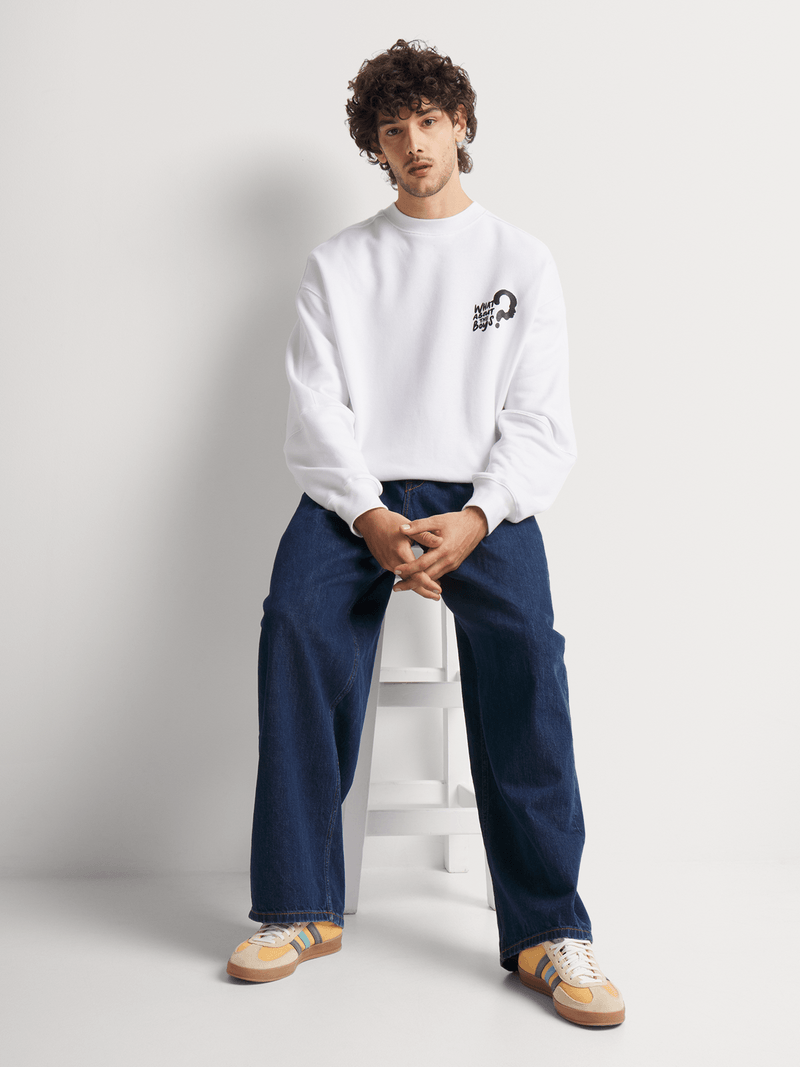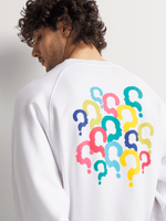 Express your individuality with the Markham "What About The Boys" Cutline Graphic Sweatshirt. Featuring a clean white base with a bold chest logo and a vibrant multicoloured question mark graphic on the back, this sweatshirt is all about sparking curiosity and conversation. Crafted from a soft cotton-blend fabric, it delivers everyday comfort with standout style. The relaxed fit and ribbed trims make it perfect for layering or wearing on its own.
