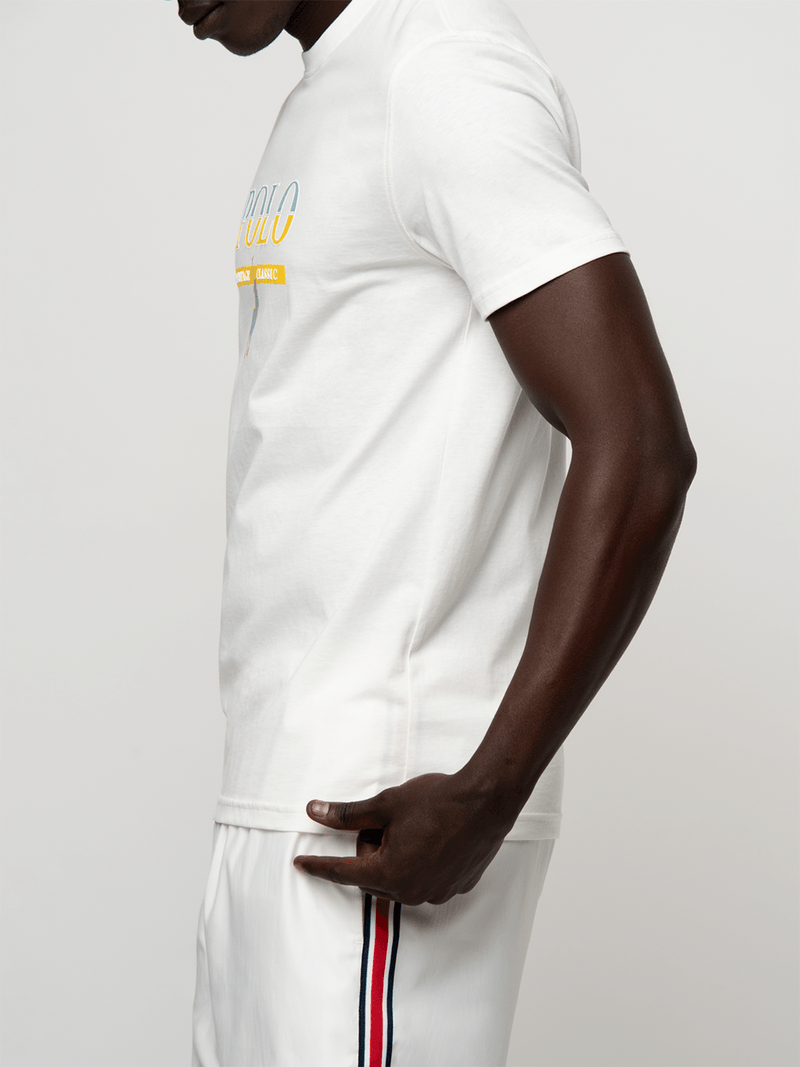 Stay cool and stylish in our white printed graphic t-shirt. Made with 100% cotton for a comfortable fit. Features a classic polo collar and short sleeves. Easy to care for with cool wash instructions. Perfect for everyday wear. Available in various sizes. Made in Madagascar.