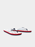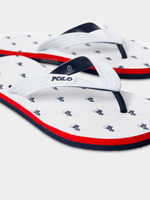 Step into summer in style with our Polo White Monogram Flip Flops. Made with a comfortable synthetic material, they feature a classic monogram design. Easy to clean with a damp cloth. Perfect for beach days or casual outings.