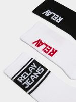 Step up your sock game with these Men's Relay Jeans 3-Pack Shaft White/Black socks. Made from a comfortable cotton blend, these socks are designed to keep your feet cozy and stylish. With a cool wash, these socks are easy to maintain. Elevate your everyday look with this wardrobe essential.
