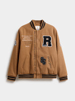 The Relay Jeans Gentlemen's Camel Varsity Jacket features a classic sporty design with black striped ribbing on the collar, cuffs, and hem. The elegant camel color complements the sleek buttons, offering a stylish twist on a timeless varsity look. Ideal for casual outings with a touch of flair.