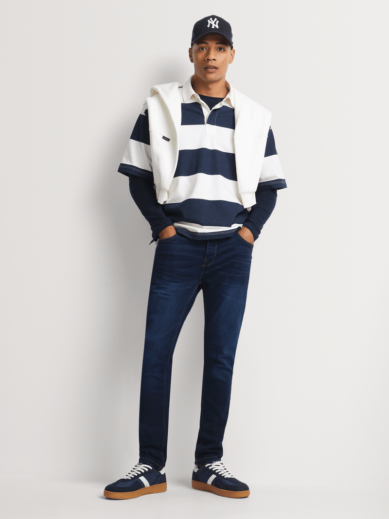 The Sustainable Skinny Leg Dark Blue Denim offers a sleek, modern fit with a mid-waist design that sits comfortably. Crafted from premium stretch fabric, it provides exceptional flexibility while maintaining a tight, streamlined look from top to bottom. Perfect for effortless styling, this sustainable denim pairs seamlessly with casual and smart-casual outfits.
