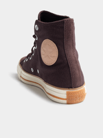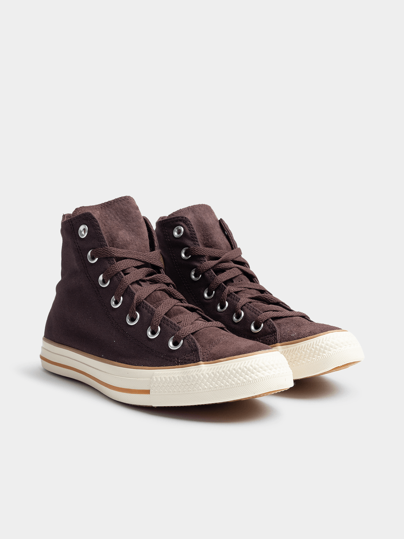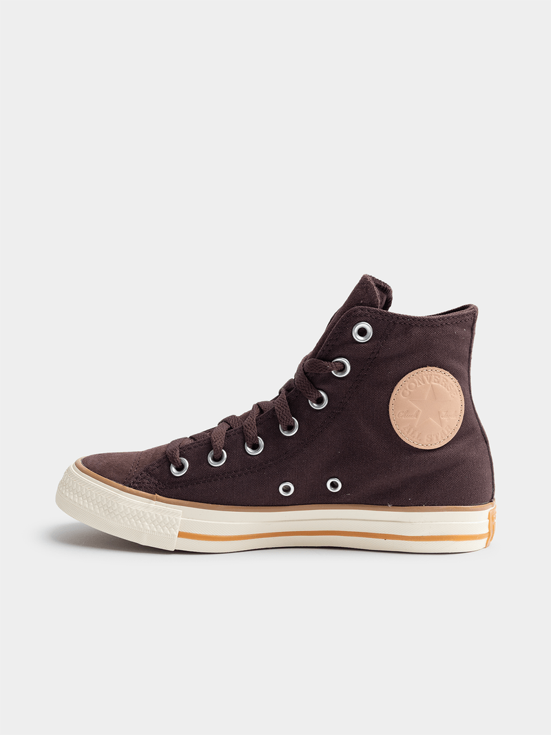 Step up your sneaker game with these brown and white Converse Chuck Taylor All Star Hi sneakers. Crafted from durable canvas, these kicks are perfect for everyday wear. With a classic design and comfortable fit, these sneakers are sure to become your new go-to pair. Stylish and versatile, these sneakers are a must-have in any wardrobe.
