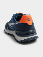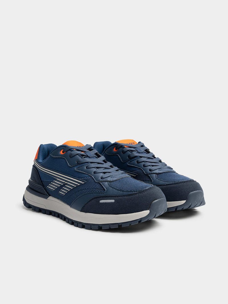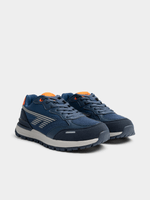 The Vesta sneaker in navy and orange combines modern urban style with practical features. Its ripstop and mesh construction ensures durability and breathability, keeping your feet comfortable. With PU and suede overlays for support and a sleek look, plus a lightweight rubber outsole for grip, these shoes are perfect for navigating the city in style.