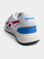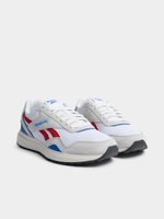 Kick back in style with the Reebok GL1100 sneaker! This grey, red, and blue shoe features a breathable mesh fabric upper for all-day comfort. Whether you're hitting the gym or running errands, these sneakers are the perfect combination of fashion and function. Plus, they're returnable if they don't work out for you. Step up your sneaker game with Reebok!