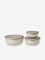 Upgrade your storage containers with the Mepal Cirqula Round Bowl Set. These convenient multi-purpose bowls in a range of practical sizes come with a clear window in the lid so you can quickly and easily see what's stored inside. 100% airtight and leakproof, these handy containers keep food fresh for longer and are ideal for the fridge, freezer and microwave.