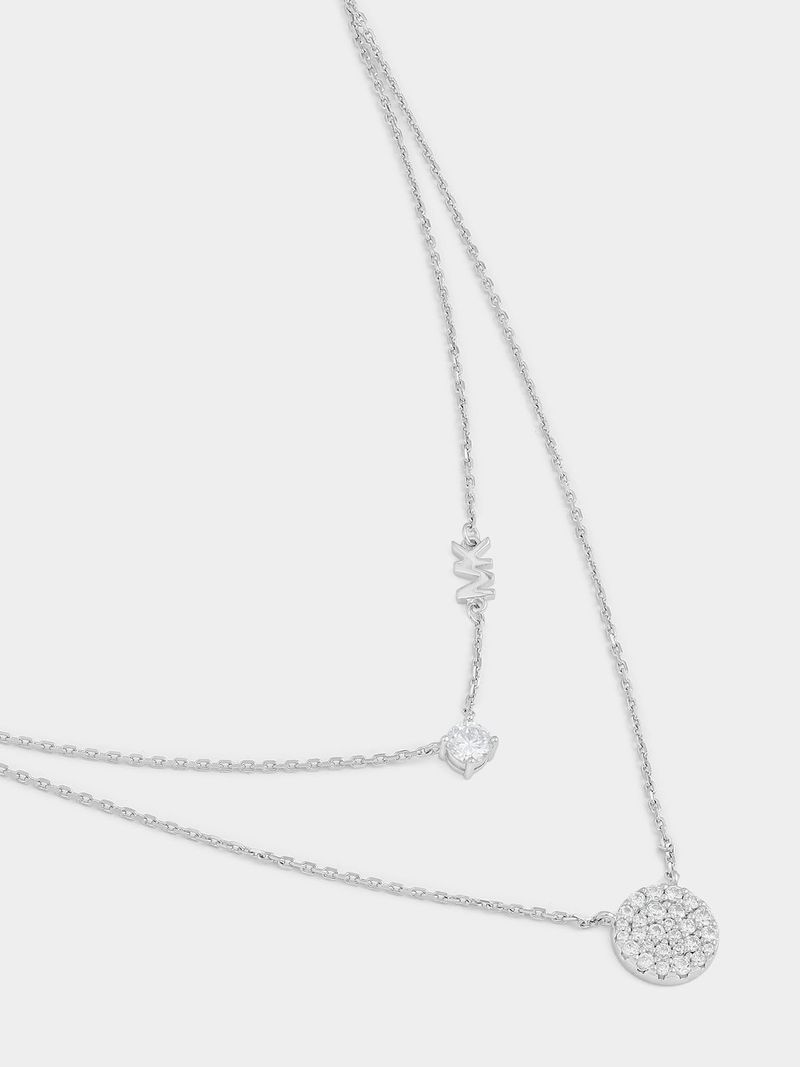 Easily achieve a luxe look for everyday wear with Kors Brilliance. The new double layered necklace is designed with a radiant focal stone and a sparkling pavé encrusted disk. This gorgeous Sterling Silver piece features beautiful cubic zirconia and has subtle branding embedded into the chain. Effortlessly create a layered look by styling this necklace with any ensemble!