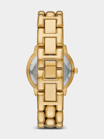Defined by sculptural half-moon chain links, the Phoebe watch offers a sleek yet playful approach to timekeeping. A newly designed rounded MK logo is seamlessly integrated into the 36 mm dial, nodding to the Michael Kors Collection. Its gold-tone stainless steel finish enhances the statement-making design, delivering a perfect blend of modern glamour and iconic brand heritage.