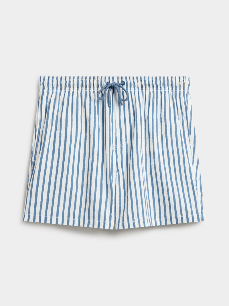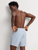 Elevate your summer style with these Markham Men's Seersucker Stripe Blue Swim Shorts. Made from polyester fabric for a comfortable fit. Features irregular blue and white stripes for a trendy look. Easy to care for with warm wash and cool iron instructions. Embrace the sunny days in style with these swim shorts.