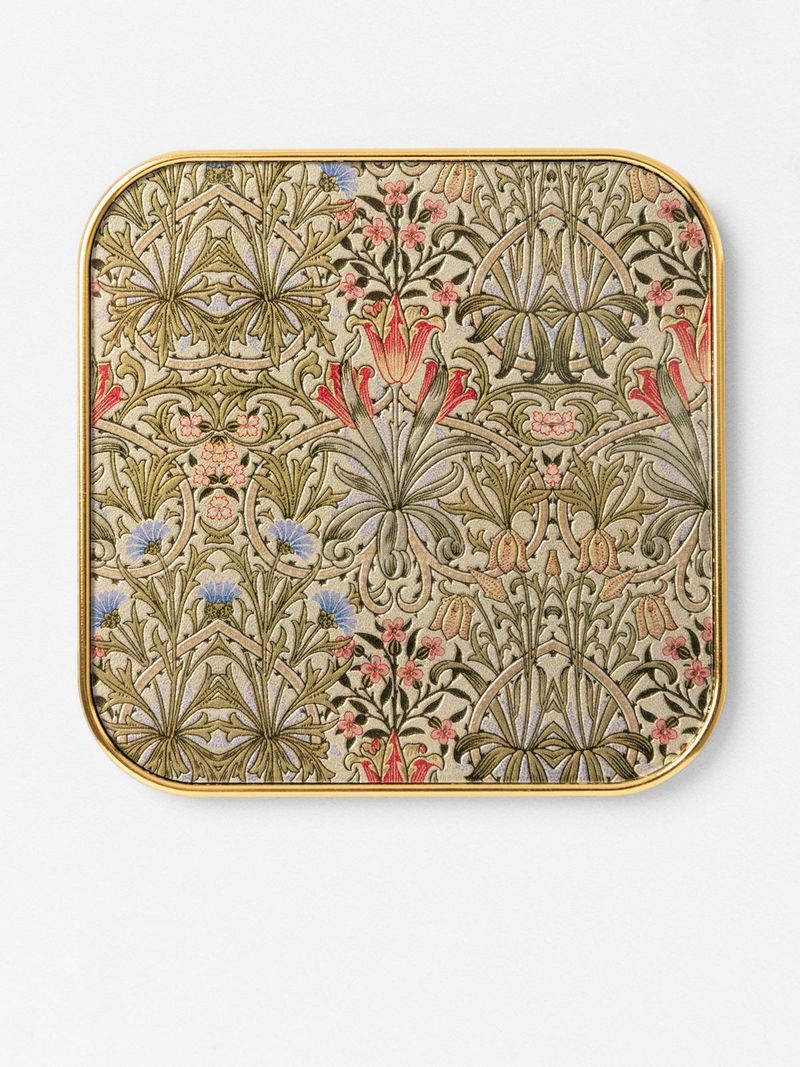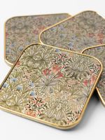 Elegant and luxe, our Morris Printed Coaster Set features an intricate floral print in muted tones, complemented by a gold-tone border. The included holder keeps them together when not in use. Ideal for your drinks trolley, or a thoughtful addition to a host gift.