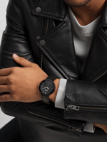 This stylish Black Plated bracelet watch features a round case with a black top ring and textured black dial.