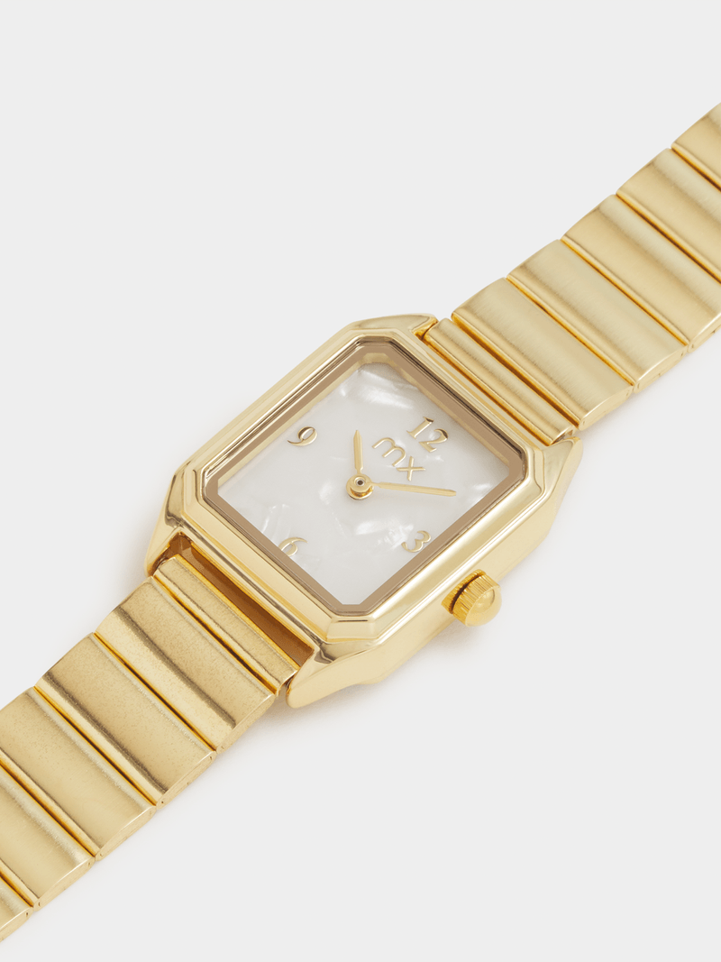 This elegant Gold Plated bracelet watch features a rectangle case and sleek Mother Of Pearl dial.