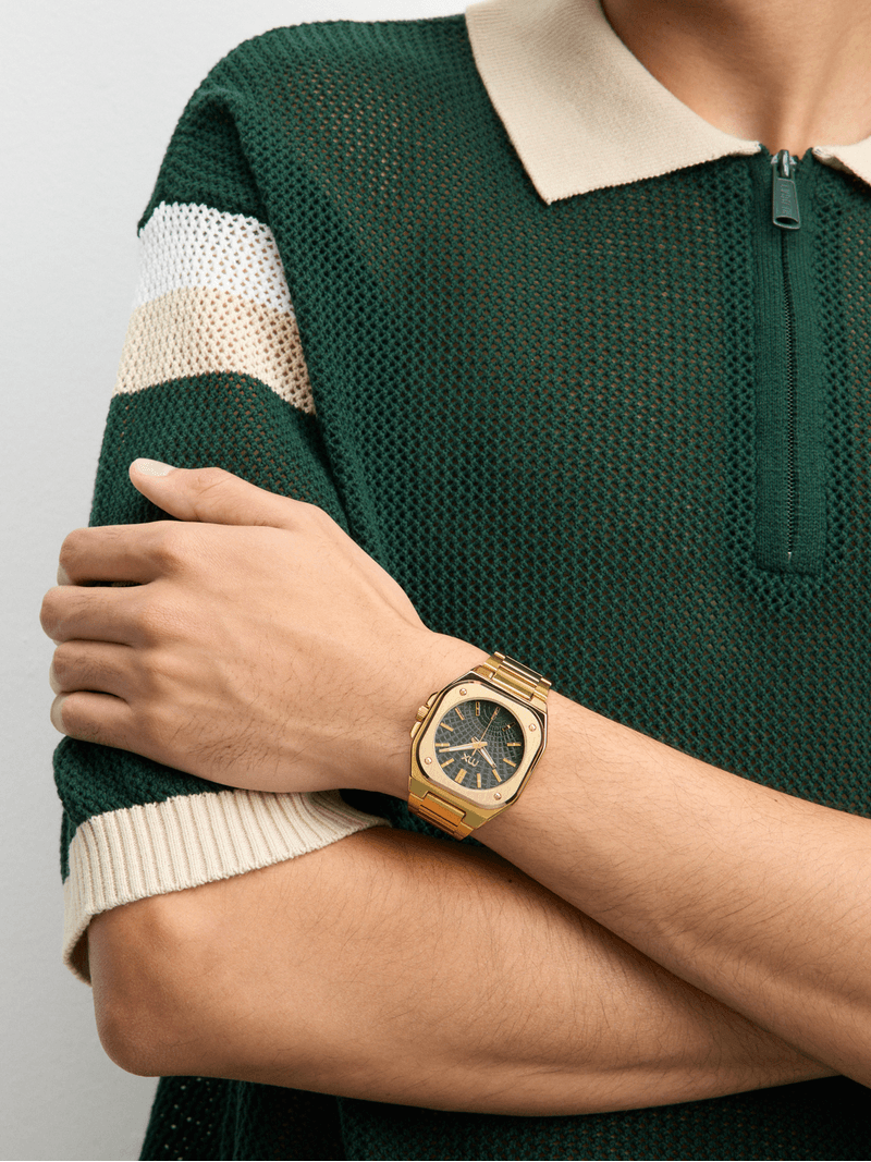 This stylish Gold Plated bracelet watch features a bold square case and textured black dial.