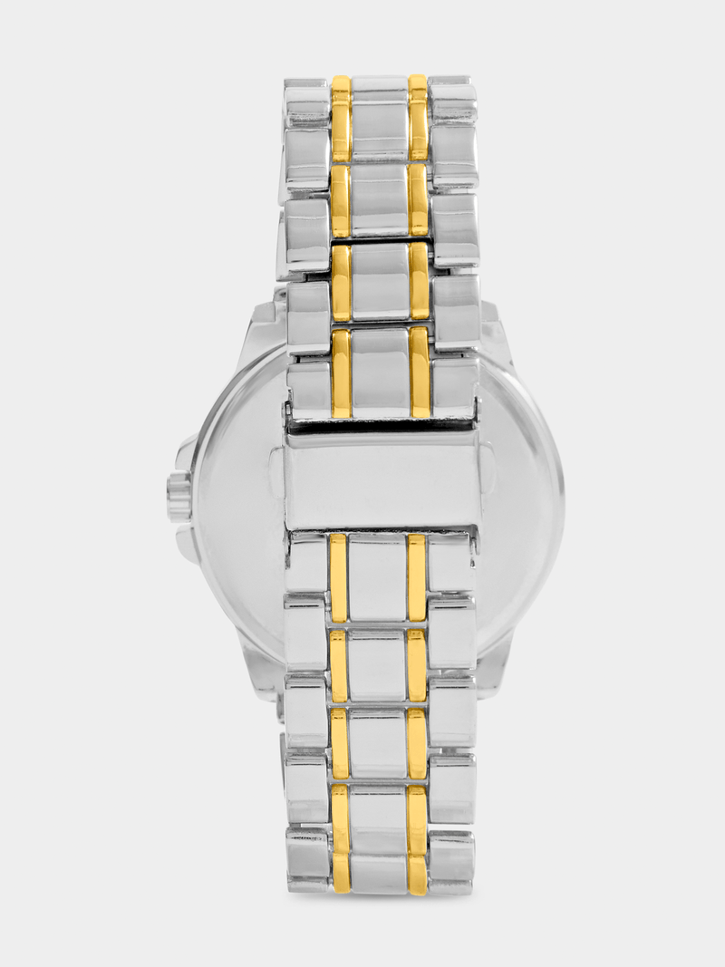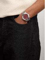 This bold bracelet watch features a Silver Plated round case, textured red dial and Gold Plated two-tone bracelet strap.