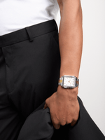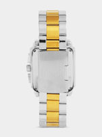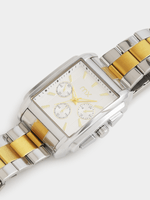 This stylish watch features a Gold Plated rectangle case, white multi-fashion dial and two-tone bracelet strap.