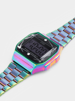 This eye-catching iridescent bracelet watch features a hexagonal case and black digital face.