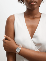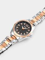 This classic watch features a Rose Plated round case, sleek charcoal dial and two-tone bracelet strap.