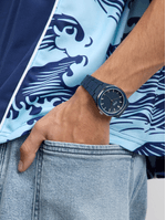 This stylish, matte-textured watch features a Silver and Navy Plated round case, navy dial and Navy Plated bracelet strap.