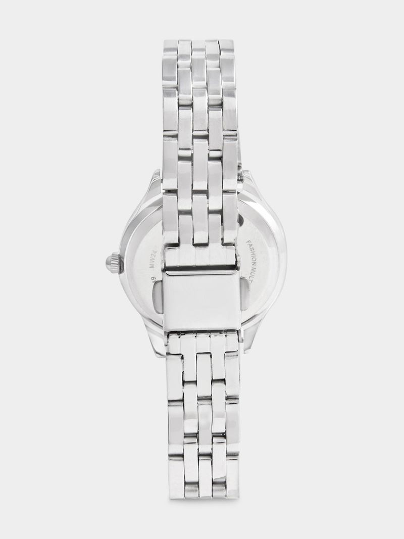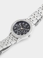 This glamorous Crystal-embellished Silver Plated bracelet watch features a round case and sleek black dial.