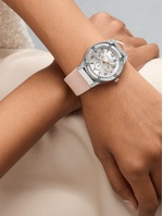 This glamorous Crystal-embellished watch features a Silver Plated round case, sleek silver dial and pink faux leather strap.