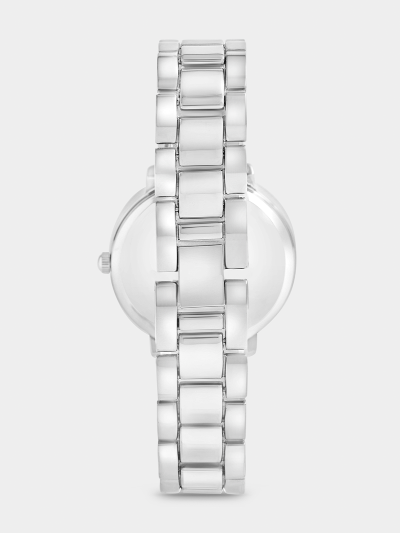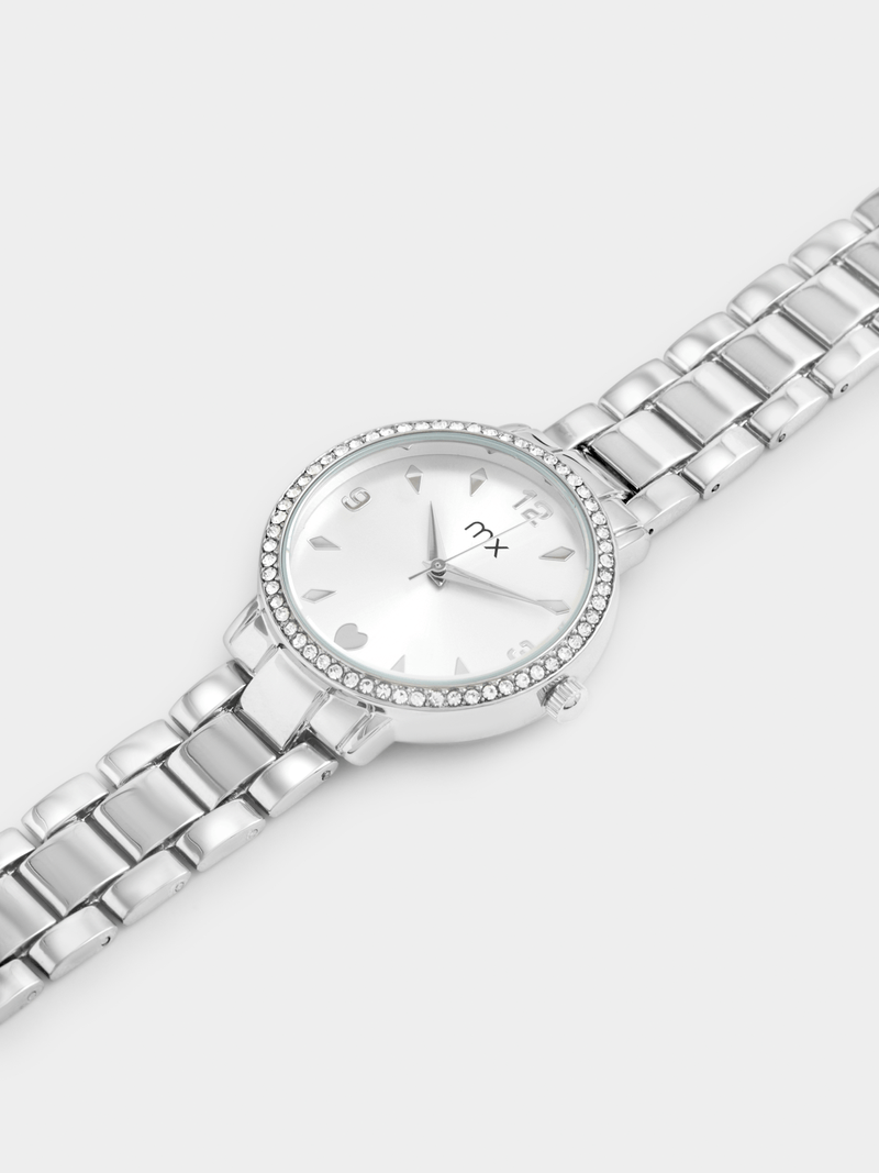 This glamorous Crystal-embellished Silver Plated bracelet watch features a round case and silver toned dial enhanced by a heart design.