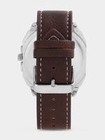 This stylish watch features a Silver Plated square case, sleek grey dial and brown faux leather strap.
