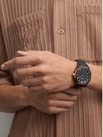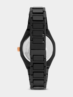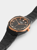 This stylish, matte-textured watch features a Rose and Black Plated round case, black dial and Black Plated bracelet strap.