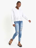 Classic skinny leg jeans are a wardrobe staple. These super skinny leg jeans with rip detail and frayed hems are ultra comfy and stylish, perfect for laid-back weekends. Super skinny leg fit, Stretch denim, Medium wash, Five pockets, Zip up with button, Rip detail, Frayed hems