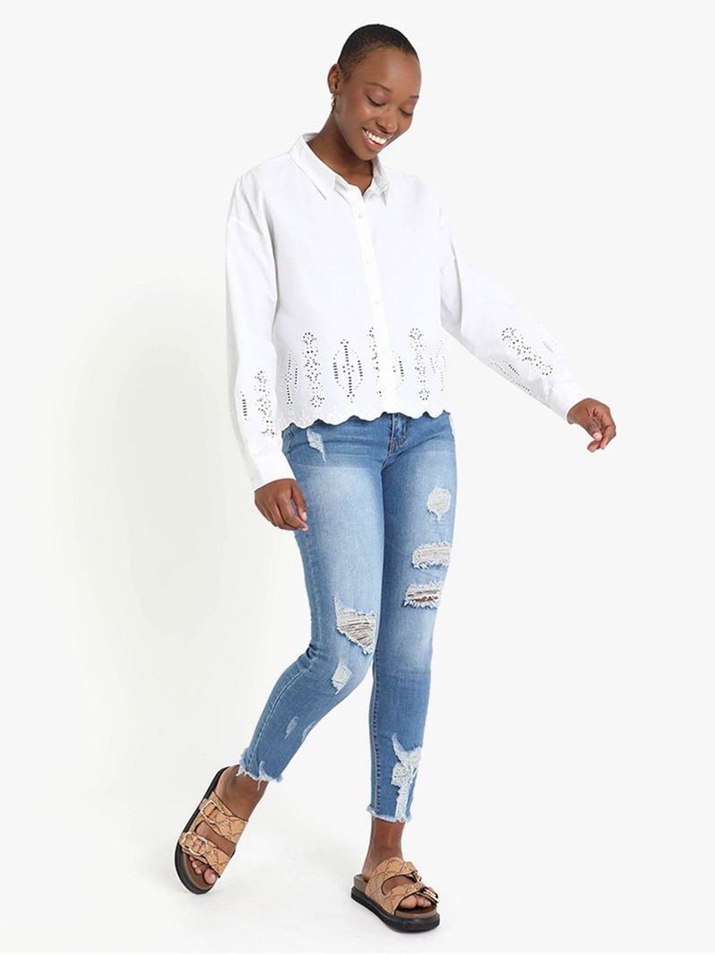Classic skinny leg jeans are a wardrobe staple. These super skinny leg jeans with rip detail and frayed hems are ultra comfy and stylish, perfect for laid-back weekends. Super skinny leg fit, Stretch denim, Medium wash, Five pockets, Zip up with button, Rip detail, Frayed hems