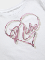 The Nike Girls Kids White Graphic T-Shirt is made of a comfortable cotton polyester blend. This stylish tee features a bold white swoosh on pointe graphic. Perfect for everyday wear, it's a versatile addition to any wardrobe. Stand out in style with this trendy Nike shirt! Supplier style: 36N146-001/001