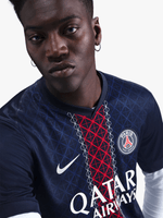 PSG's 2025/26 Home uniform takes its design cues from three famous Parisian landmarks. A striking middle stripe interrupts this classic blue kit, a design detail that was inspired by the skeletal frameworks of the architectural icons.
