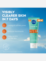 Enjoy the multiple benefits of the NIVEA Clear Up Daily Scrub, with 99% Pure Sea Salt, Salicylic Acid and Hyaluronic Acid. Collectively, these help to unclog pores and rebalance skin for a clearer, healthier look in 7 days, when used twice a day.