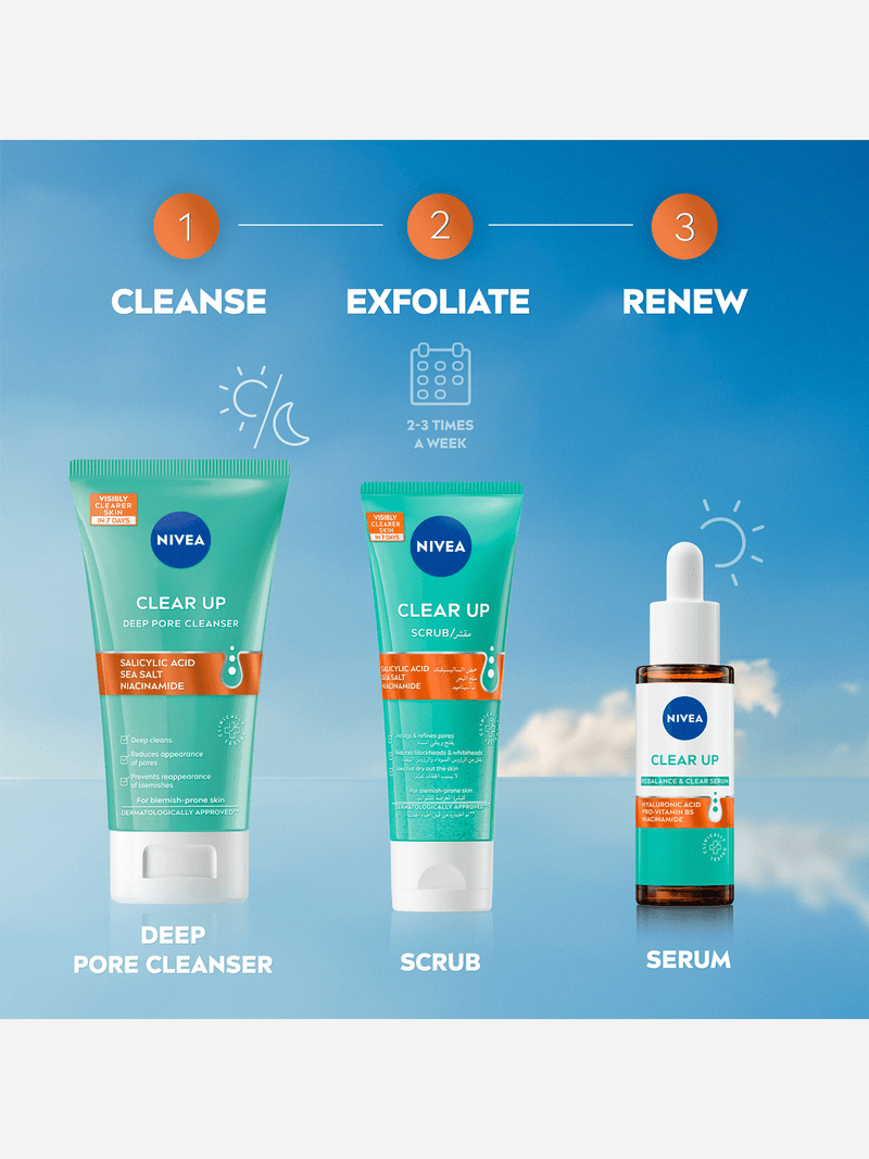 With 99% Pure Sea Salt, Salicylic Acid, Hyaluronic Acid and Magnolia Extract, the NIVEA Clear Up Deep Pore Cleanser is a cleansing face wash that helps to deeply cleanse pores and reduce blemishes and pimples in just 7 days, when used twice a day.