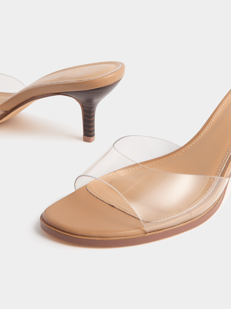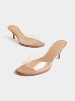 Our Clear Strap Wood Stack Kitten Heels are a versatile addition to your collection. The clear Lucite strap and stacked heel complement a wide range of looks.