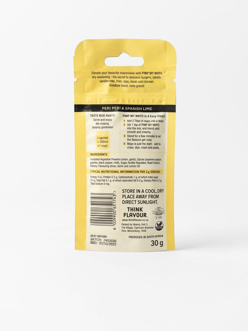 Elevate your mayonnaise with Pimp My Mayo Peri-Peri Spanish Lime Seasoning. Vegan Friendly and Halaal, simply mix it into mayo for a delicious flavour, then serve with delicious burgers, salads, sandwiches, fries, dips, steak and chicken.