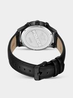 This stylish watch feature a Black Plated round case, semi-transparent cool grey dial multifunction dial and black genuine leather strap.