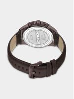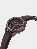 This stylish watch features a Brown Plated round case, black and brown dial with chronographic movement and brown genuine leather strap.